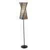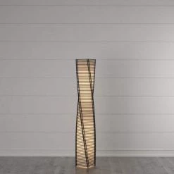 Sculptural appeal abounds in the Stix Floor Lantern. The frame is a twisting metal tower with black cane sticks, stacked and woven. A fabulous statement piece that works well with many decors. The shade is lined with a fabric-like beige paper that casts a warm light. The ball feet at each corner protect surfaces. 50 in. H.