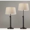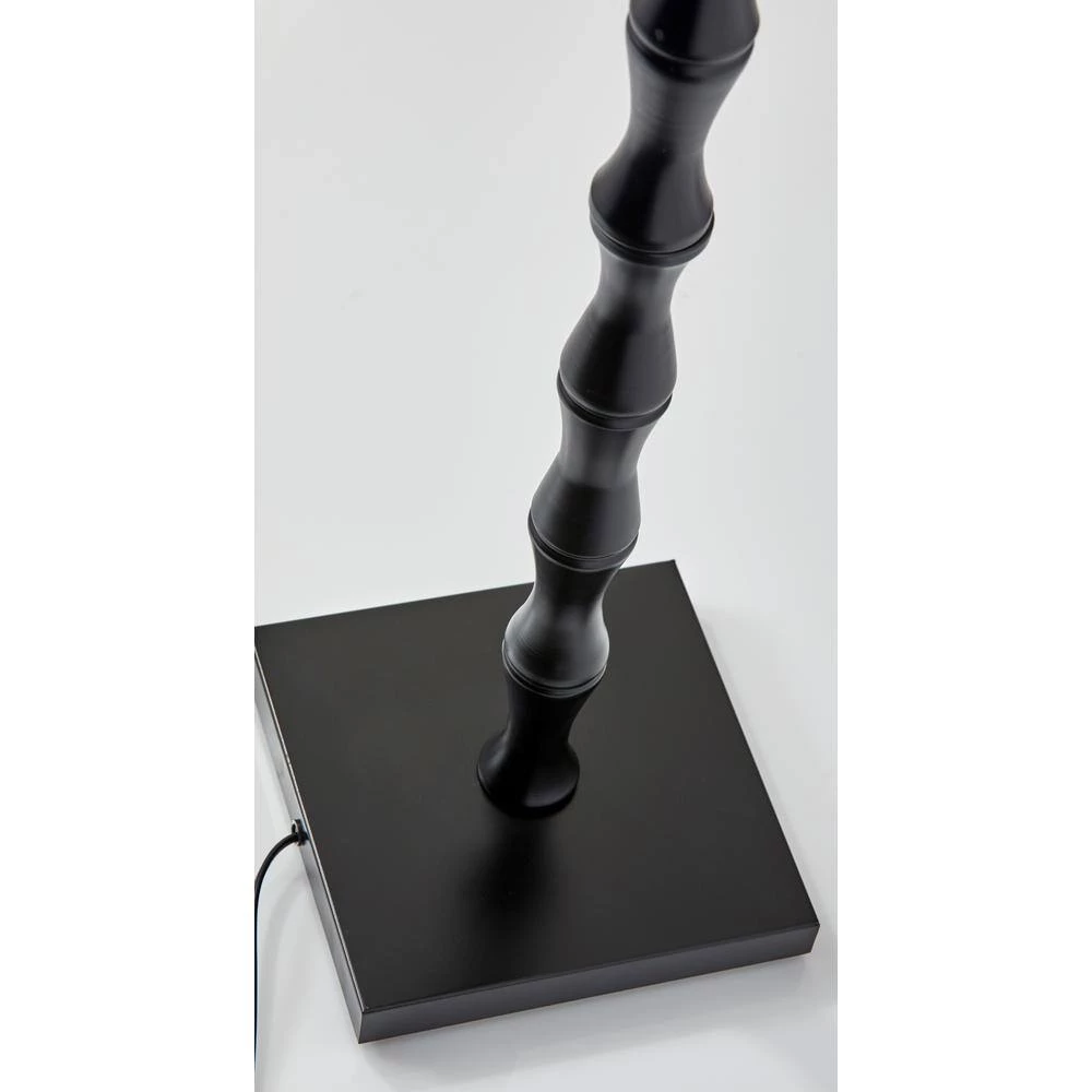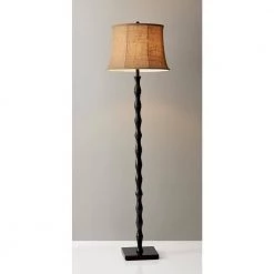 This elegant transitional lamp will make the perfect accent lamp in your living space. It has a nicely painted black metal base which resembles carved wood. A finely woven burlap bell shade is secured by a round black wooden finial. Its three-way rotary switch for your desired light output preference.