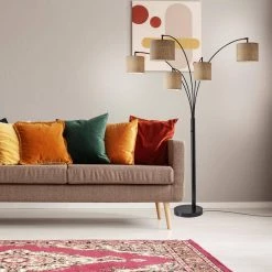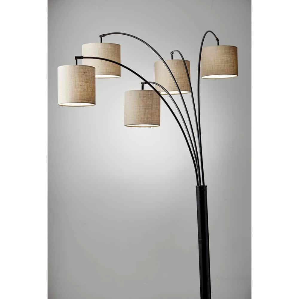 A substantial lighting solution for the living room or sectional, the Trinity 5-Arm Arc Lamp goes above and beyond the typical arc lamp. 5 beige burlap drum shades are suspended from antique bronze finished curved arms to create efficient overhead lighting for a large area. A 4-way rotary switch on the pole allows for a full range of bright or mood lighting. This lamp has a clear cord and is smart outlet compatible. Bulbs are not included. This lamp ships in 2 separate boxes in order to protect the quality of the lamp shades from the heavy base.