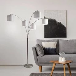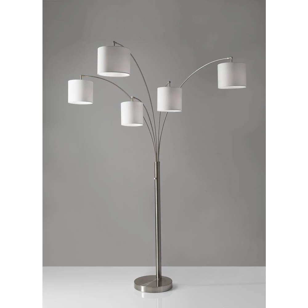 A substantial lighting solution for the living room or sectional, the Trinity 5-Arm Arc Lamp goes above and beyond the typical arc lamp. 5 white drum shades are suspended from elegant brushed steel curved arms to create efficient overhead lighting for a large area. A 4-way rotary switch on the pole allows for a full range of bright or mood lighting. This lamp has a clear cord and is smart outlet compatible. Bulbs are not included. This lamp ships in 2 separate boxes in order to protect the quality of the lamp shades from the heavy base.