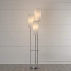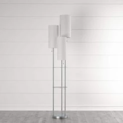 A triple play for design, the Trio floor lamp offers plenty of light and acts as a table all within a decorative yet small footprint. Three satin steel poles secured in a round base each hold a white linen cylindrical shade. The poles also support two clear acrylic shelves for displaying photos or other treasures.