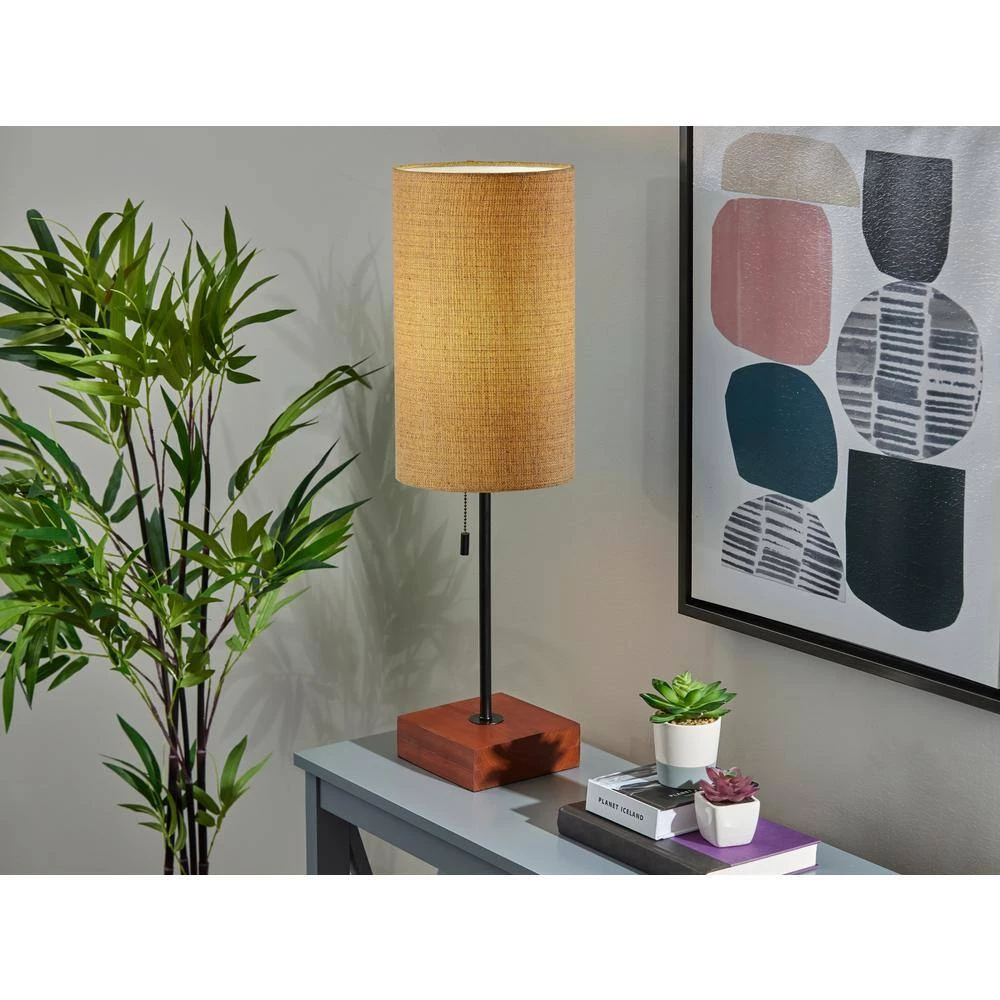 Illuminate your space in a stylish pop of color with the 26.75 in. tall Trudy table lamp. This modern lamp artfully mixes materials and shapes, with a cube-shaped base in a warm walnut finish, a thin black stem and tall drum-shaped shade. The mustard yellow textured fabric shade softly distills light from the 60-Watt bulb (not included). Operated by a black metal pull chain switch that matches the stem, the table lamp also features a 5 ft. brown cord. The Trudy table lamp is also available with a blue textured fabric shade or a beige and brown textured fabric shade.