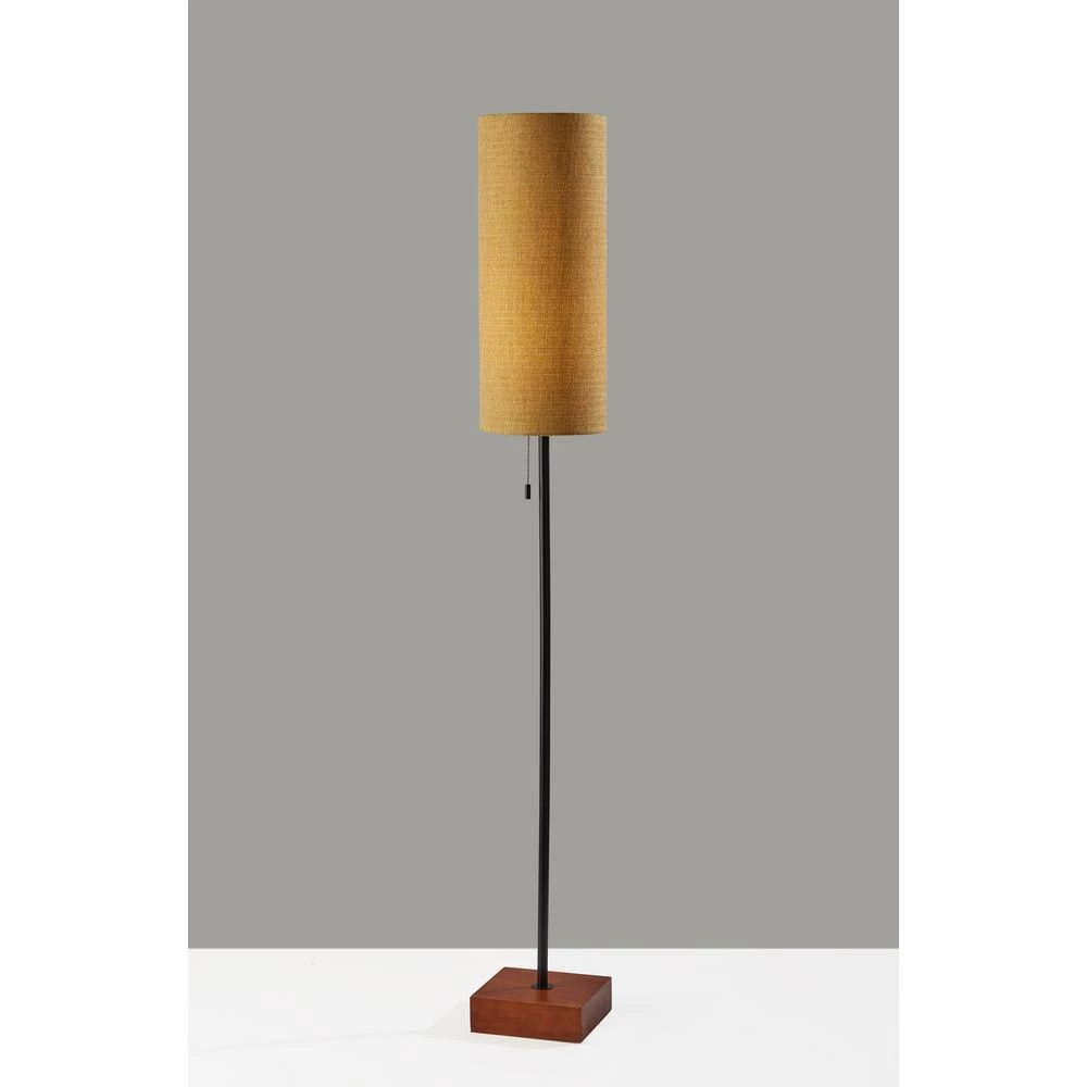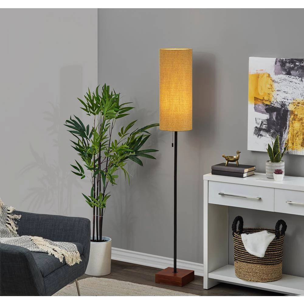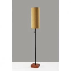Illuminate your space in a stylish pop of color with the 62 in. tall Trudy floor lamp. This modern lamp artfully mixes materials and shapes, with a cube-shaped base in a warm walnut finish, a thin black stem and tall drum-shaped shade. The mustard yellow textured fabric shade softly distills light from the 100-Watt bulb (not included). Operated by a black metal pull chain switch that matches the stem, the table lamp also features a 6 ft. brown cord. The Trudy floor lamp is also available with a blue textured fabric shade or a beige and brown textured fabric shade.