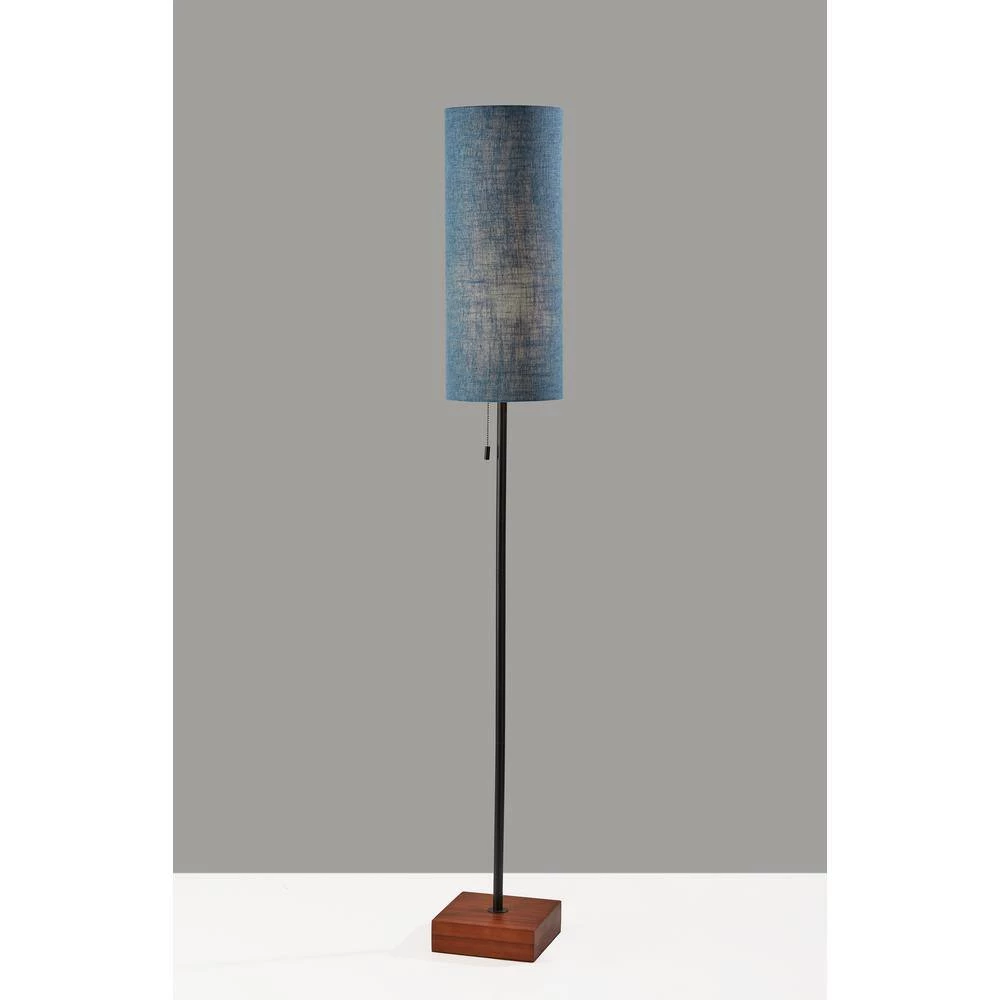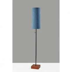 Illuminate your space in a stylish pop of color with the 62 in. tall Trudy floor lamp. This modern lamp artfully mixes materials and shapes, with a cube-shaped base in a warm walnut finish, a thin black stem and tall drum-shaped shade. The blue textured fabric shade softly distills light from the 100-Watt bulb (not included). Operated by a black metal pull chain switch that matches the stem, the table lamp also features a 6 ft. brown cord. The Trudy floor lamp is also available with a beige and brown textured fabric shade or a mustard yellow textured fabric shade.