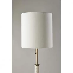The 63 in. tall Vanessa floor lamp brightens your space with a touch of contemporary styling. The lamp features a clean, round 10 in. Dia metal base with an antique brass finish. A matching antique brass stem with 3 cylindrical, diamond-patterned, cream ceramic accent pieces brings a distinctive and eye-catching design. This modern lamp is topped off with a tall 16 in. H and 15 in. Dia drum shade made of textured off-white fabric that softly distills light from a 100-Watt bulb (not included). Operated by a pull chain switch with an antique brass finish, the lamp also includes a 6 ft. clear cord. The Vanessa floor lamp is also available with a black metal base and stem, taupe ceramic accent pieces and taupe textured fabric shade or with a brushed steel base and stem, grey patterned ceramic accent pieces and white textured fabric shade.