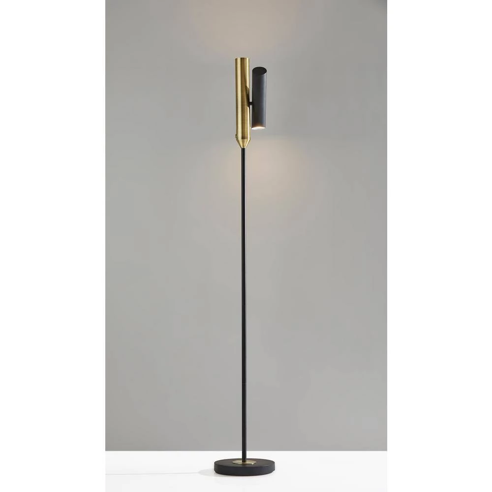 Add some mid-century modern flare to your space with the Vega LED Torchiere. Black and antique brass metals are mixed to create a sleek, unique silhouette. A convenient 4-way touch switch adjusts the light to 4 different settings: All on, Upplight on only, Downlight on only, All off. The downlight is adjustable and can serve as a task light if needed. The LED’s are integrated into the lamp and are not replaceable, but last 50,000-hours. Used 12-hours a day, this will last more than 11-years.