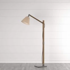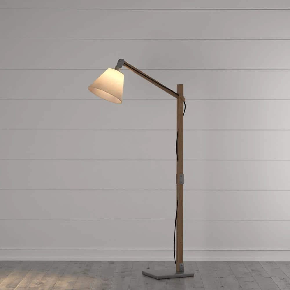 The Walden floor lamp blends rustic and contemporary design with its natural wood body and satin nickel metal base. Wood pegs let you adjust the height of the lamp and shade angle. The bell-shaped shade is an off-white poly/cotton fabric. A black fabric power cord runs through the arm and out the back of the lamp. Walden has a three-way rotary socket switch. This unique lamp takes 1×100-Watt maximum or three-way CFL equivalent (bulbs not included). Walden is also available in a table version.