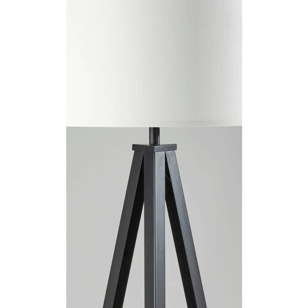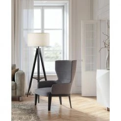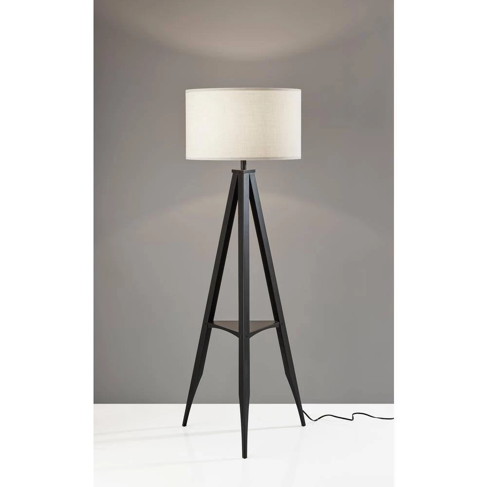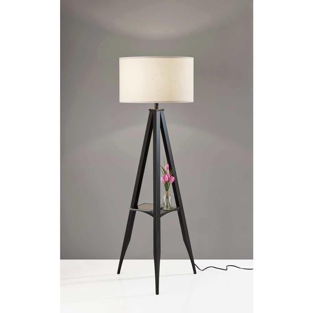 Defined by simplicity and clean lines, the 61.5 in. tall Warren shelf floor lamp adds multi-functional style to your space. It features a black metal tripod frame with tapered legs and an open 14 triangular shelf in matching black metal. With a clearance of 20, the shelf provides convenient storage and display of your favorite accent pieces, making the lamp an ideal choice for placement by couches or in room corners for illumination and functional style. Topping the metal frame is a large off-white linen drum shade that softly diffuses the light from the 150-Watt bulb (not included) for a warm glow. Operated by a 3-way rotary socket switch to easily change the lighting level between high, medium, low and off, the floor lamp also features a 6 ft. black cord.