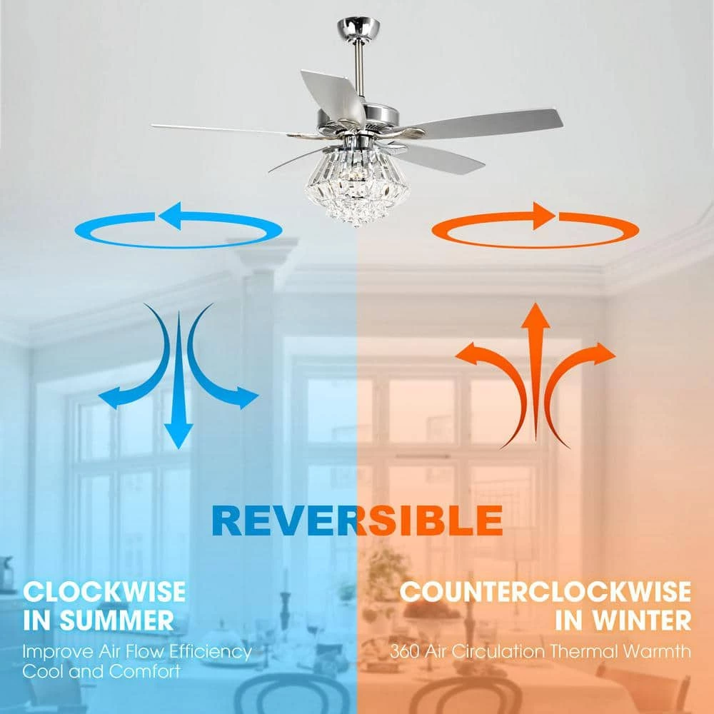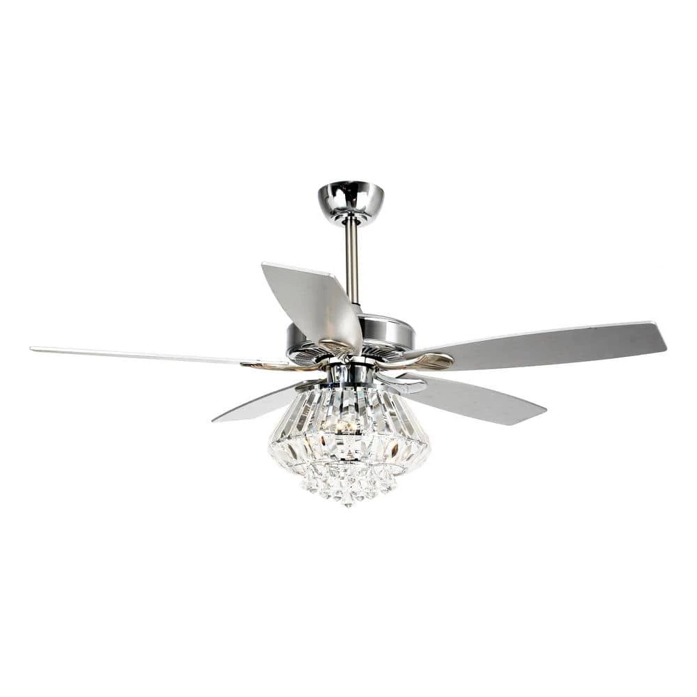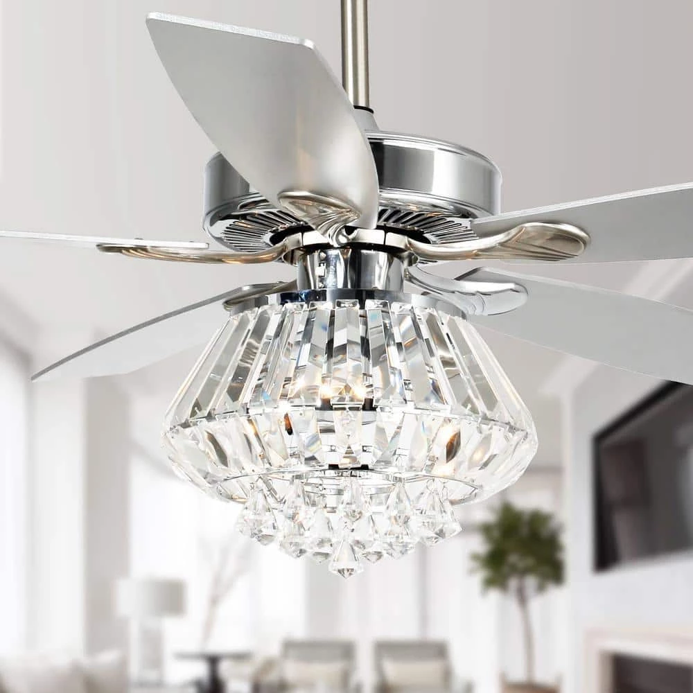 Bring timeless elegance into your home with this modern 52 in. crystal ceiling fan. Contemporary chrome finishes motor with five silver finish wooden blades and a stylish full crystal light kit, the elegant light kit is made of sparkling diamond crystal balls and geometric crystal bars, with three energy-efficient LED bulbs (not included). This crystal chandelier fan comes with a handheld remote control for easy operation.